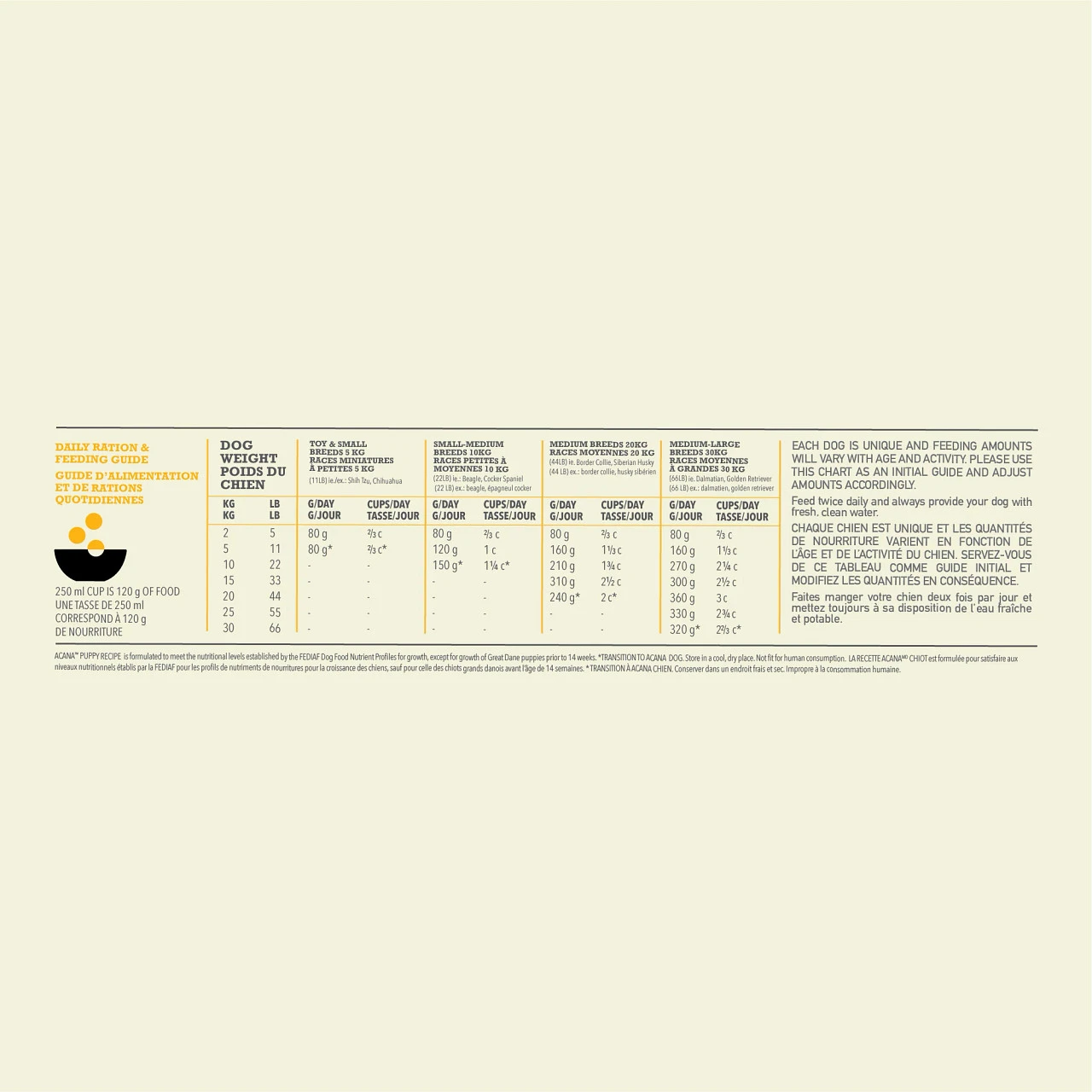Lorsqu’il s’agit de nourriture pour chiots ACANAMD, chaque ingrédient compte, c’est pourquoi notre recette Puppy All Breed a été soigneusement élaborée pour prendre soin de votre animal. Riche de 70 % d’ingrédients d’origine animale de haute qualité, comme du poulet frais, équilibrée avec 30 % de fruits, de légumes et d’ingrédients végétaux, cette recette fournit à votre chiot en pleine croissance les protéines et les éléments nutritifs dont il a besoin pour favoriser son développement rapide. Avec ces ingrédients équilibrés et de haute qualité, chaque repas de la recette pour chiots de toute race d’ACANA ressemble à un repas directement acheté sur le marché.