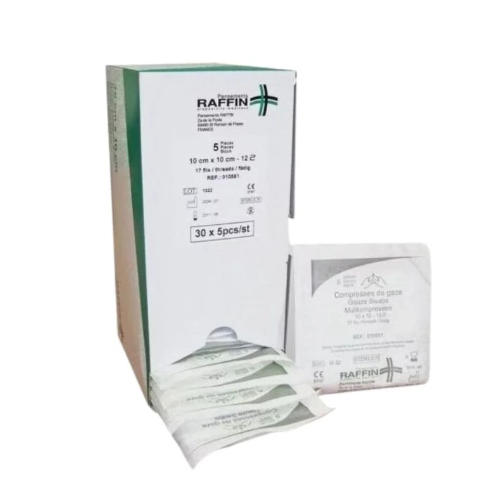 Compresses tissées à usage unique stériles (17 fils/cm2).