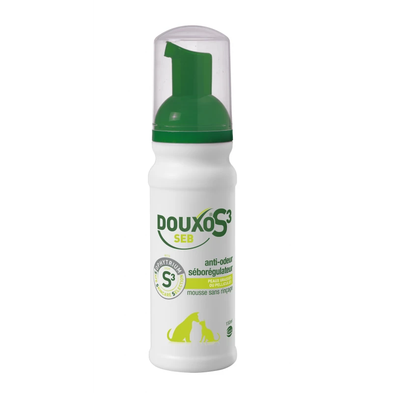 Grâce à sa composition unique associant Ophytrium et Seboliance, DOUXO® S3 SEB Mousse est une aide à la gestion topique des états kérato-séborrhéiques (séborrhée sèche, grasse ou mixte), généralisés ou localisés. Alternative au shampooing, DOUXO® S3 SEB Mousse ne nécessite aucun rinçage (pratique en cas d’absence de baignoire, animal vivant en appartement, …) et n’a aucune contre-indication ni aucun effet indésirable connus.