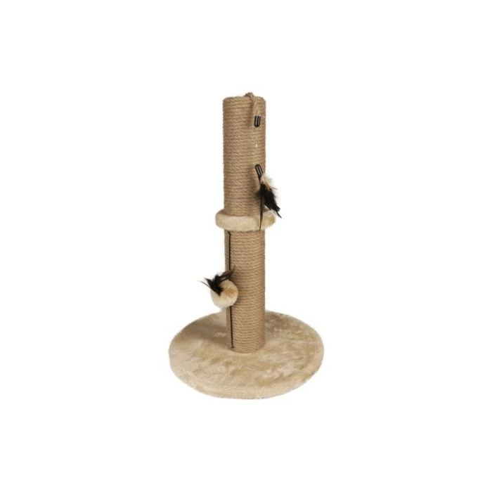 Petit griffoir fabriqué à partir d’une combinaison de peluche et de sisal. Livré avec 2 jouets à plumes.