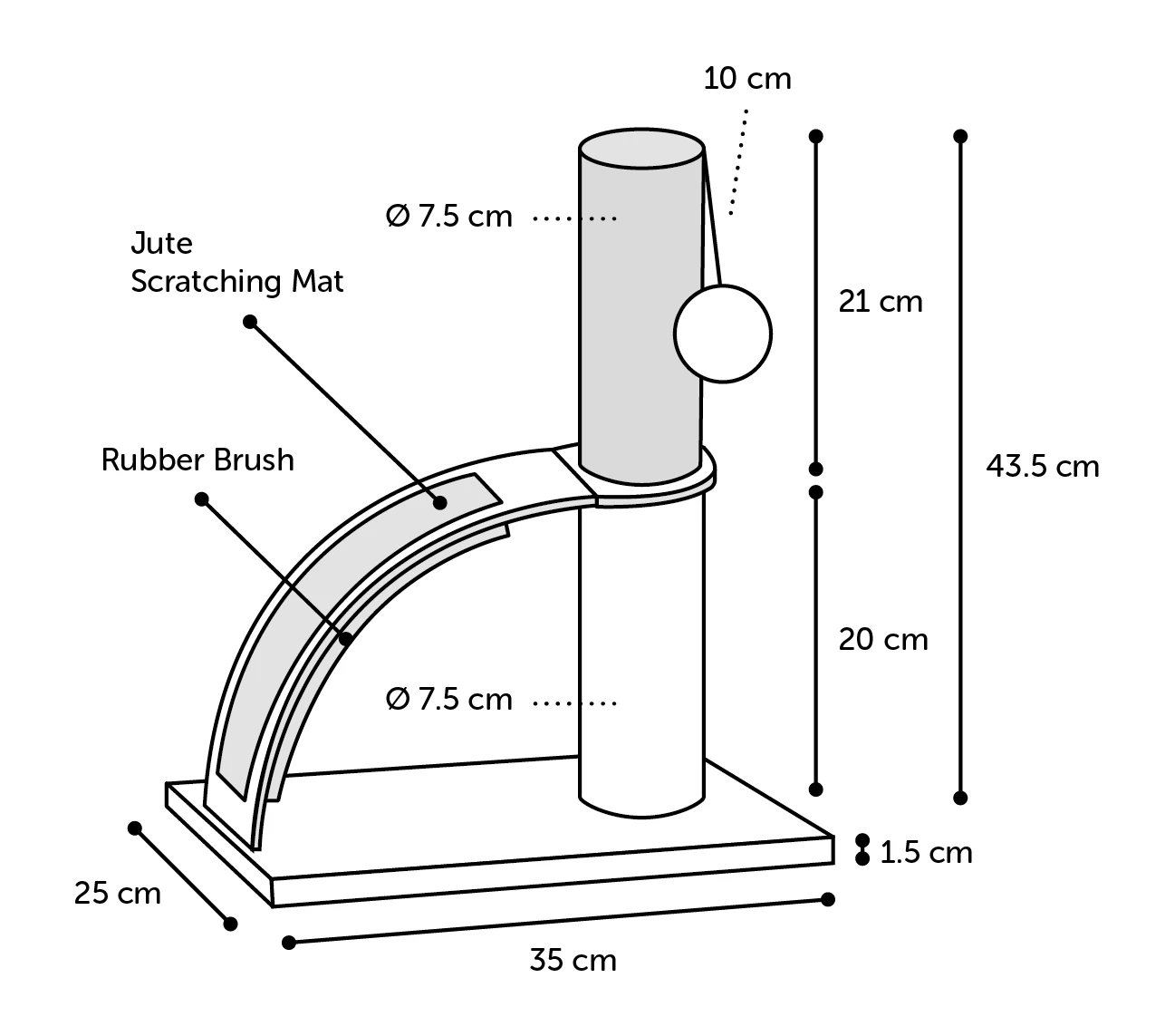 La base est recouverte d’une peluche douce. Grattoir en sisal, idéal pour entretenir les ongles. Avec une brosse en caoutchouc pour un bon massage. La petite balle avec clochette offre un plaisir de jeu supplémentaire.