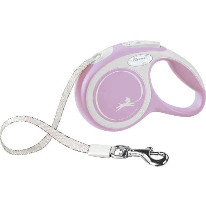 La laisse Flexi Comfort Sangle se déroule et s’enroule automatiquement et a une sangle extra large. Système de frainage confortable et poigné ajustable chez les formats M et L. Le format extra small est un format de poche. Avec cette laisse votre chien profite de sa liberté et vous êtes sûr de sa sécurité. La laisse est disponible en plusieurs formats.