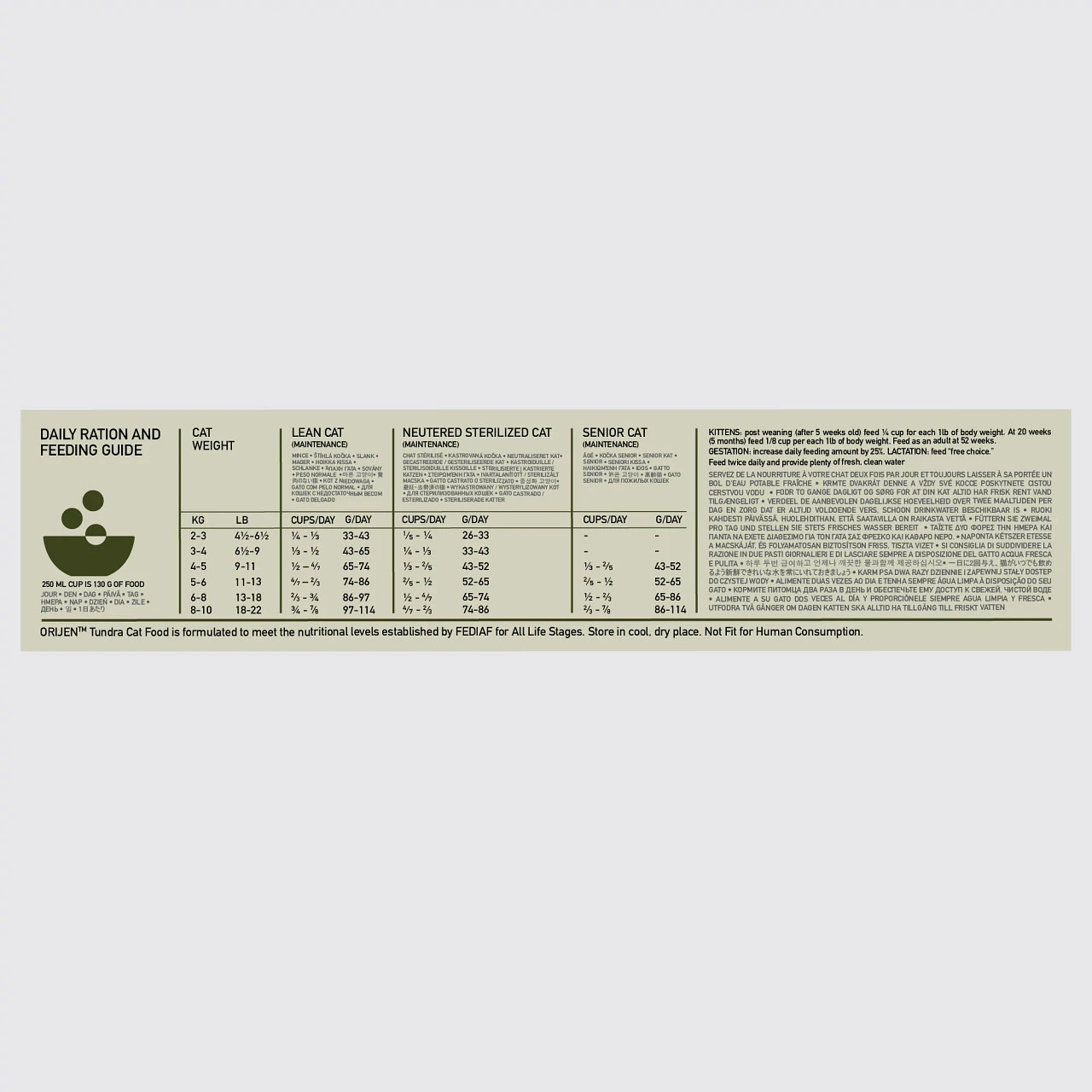 Aidez votre chat à s’épanouir grâce à des recettes riches en protéines qui lui procureront une alimentation optimale. En tant que carnivores, les chats modernes sont construits comme leurs ancêtres et s’épanouissent grâce à un régime alimentaire biologiquement adapté, riche en protéines et en graisses provenant d’une variété d’ingrédients d’origine animale. L’aliment ORIJEN Tundra pour chats est composé de viande de canard, de poisson et de viande de gibier crus. Avec des ingrédients tels que la viande et le poisson, les organes, les arêtes et les os, l’aliment ORIJEN Tundra est composée des parties les plus nutritives et juteuses de la proie de votre animal, cela permets aux chats d’accéder aux nutriments dont il a besoin.