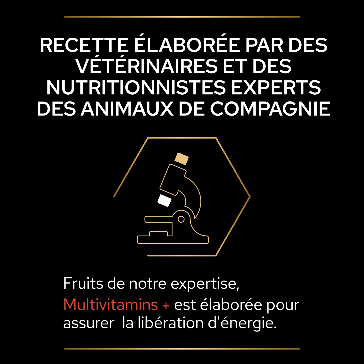PRO PLAN® a mis au point une gamme d’aliments complémentaires ciblés destinés à agir sur la mobilité, l’immunité, la vitalité, la digestion, la peau & le pelage et le bien-être. PRO PLAN® Multivitamins+ garde votre chat plein de vitalité car il contient un complexe de vitamines (vitamines B1, B2, B3, B5, B6, B12). Sa formule est scientifiquement conçue pour : – Favoriser la libération d’énergie pour la vitalité et la bonne santé générale – Aider à soutenir une peau et un pelage sain