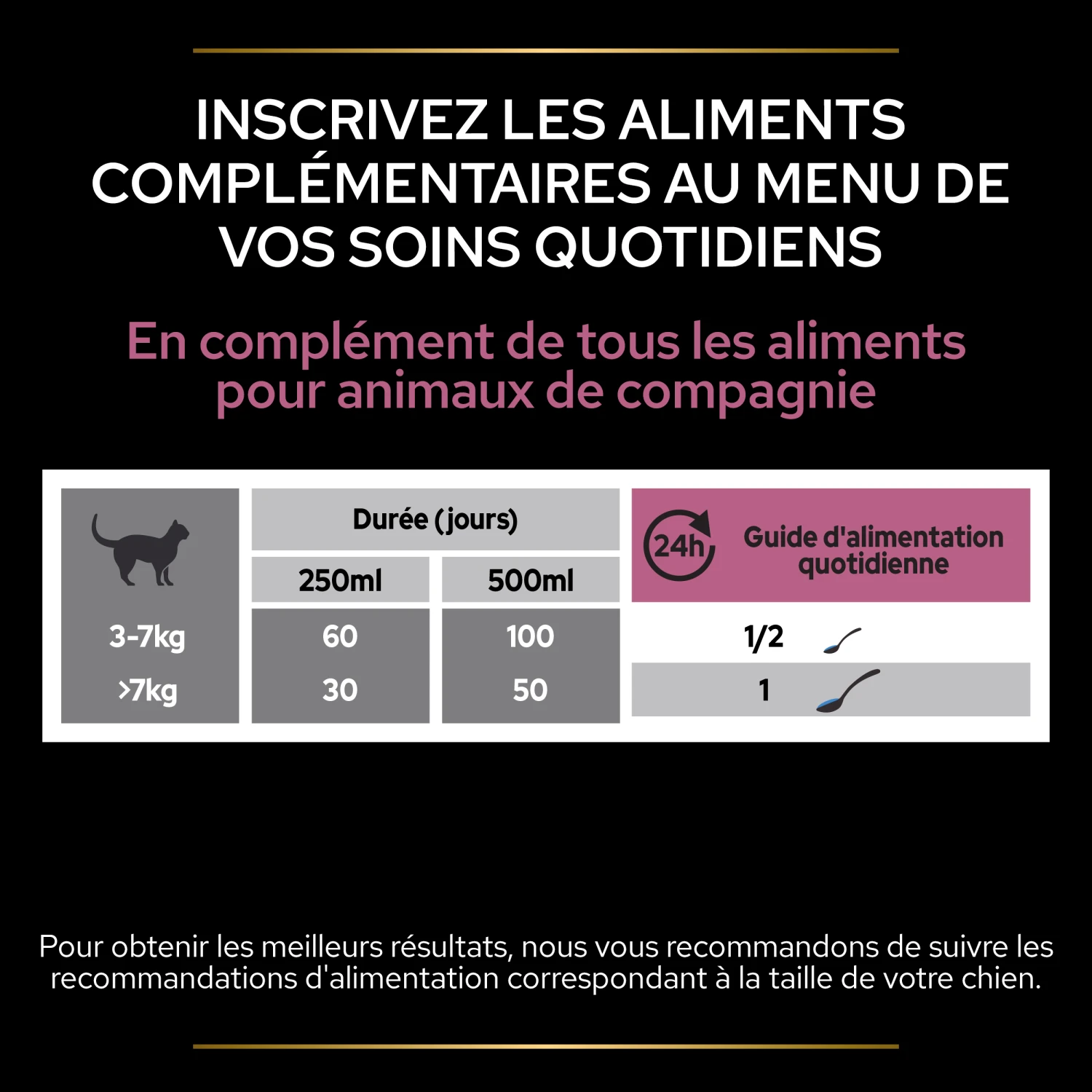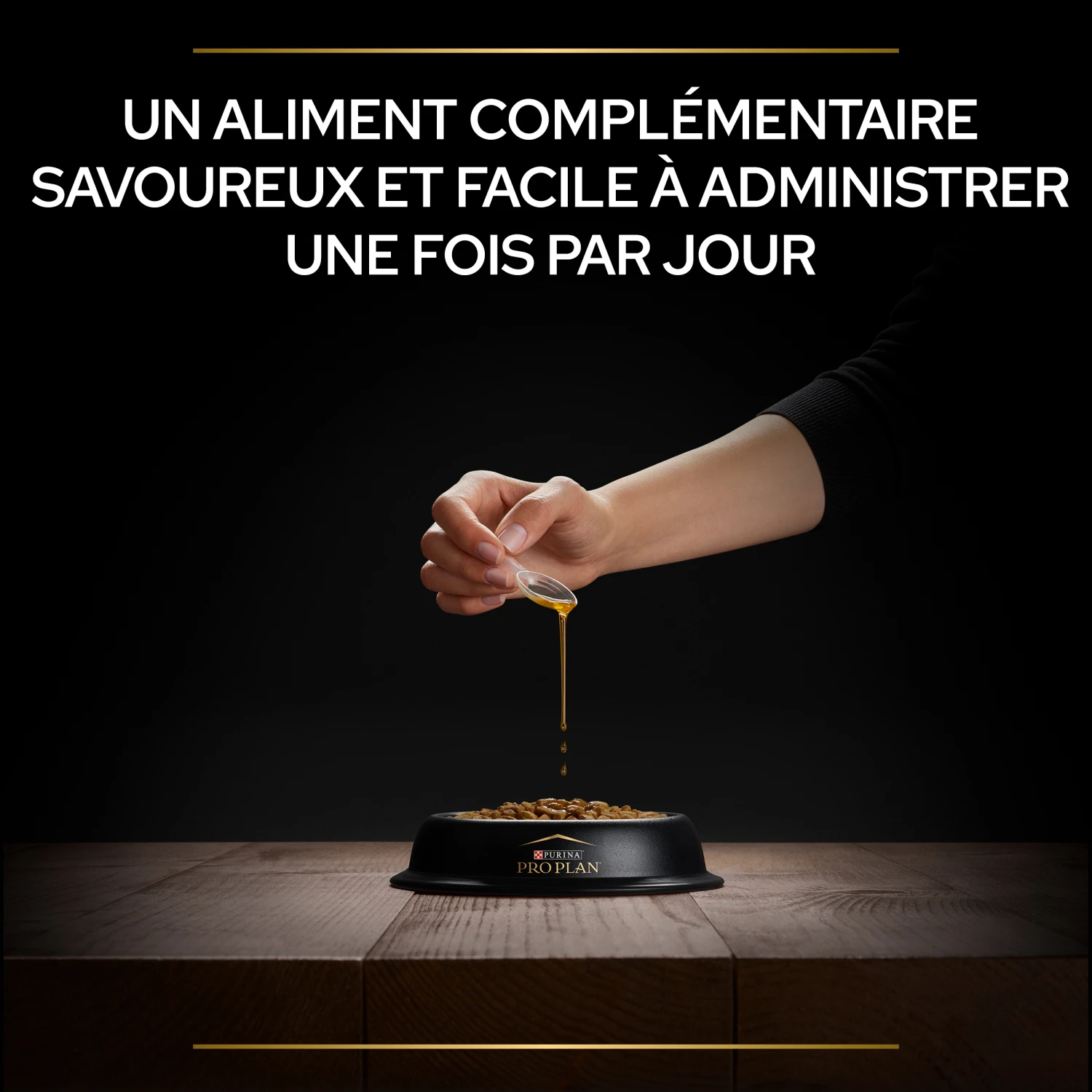 PRO PLAN® a mis au point une gamme d’aliments complémentaires ciblés destinés à agir sur la mobilité, l’immunité, la vitalité, la digestion, la peau & le pelage et le bien-être. PRO PLAN® Skin & Coat+ nourrit la peau et le pelage de votre chat de l’intérieur, grâce à sa formule riche en nutriments essentiels (tels que les acides gras Oméga 3 et 6 issus d’huile de saumon de Norvège, l’huile de lin et la vitamine E). Sa formule est scientifiquement conçu pour : – Soutenir une peau saine, hydratée et souple et un pelage brillant