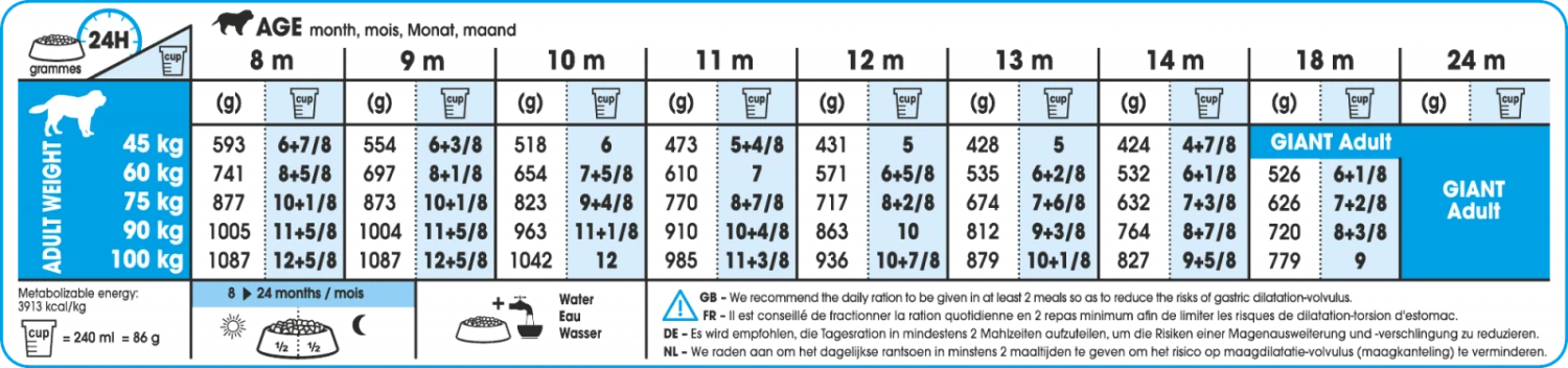 Une alimentation pour chiots de très grande race (poids adulte à partir de 45kg) de 8 à 18/24 mois.