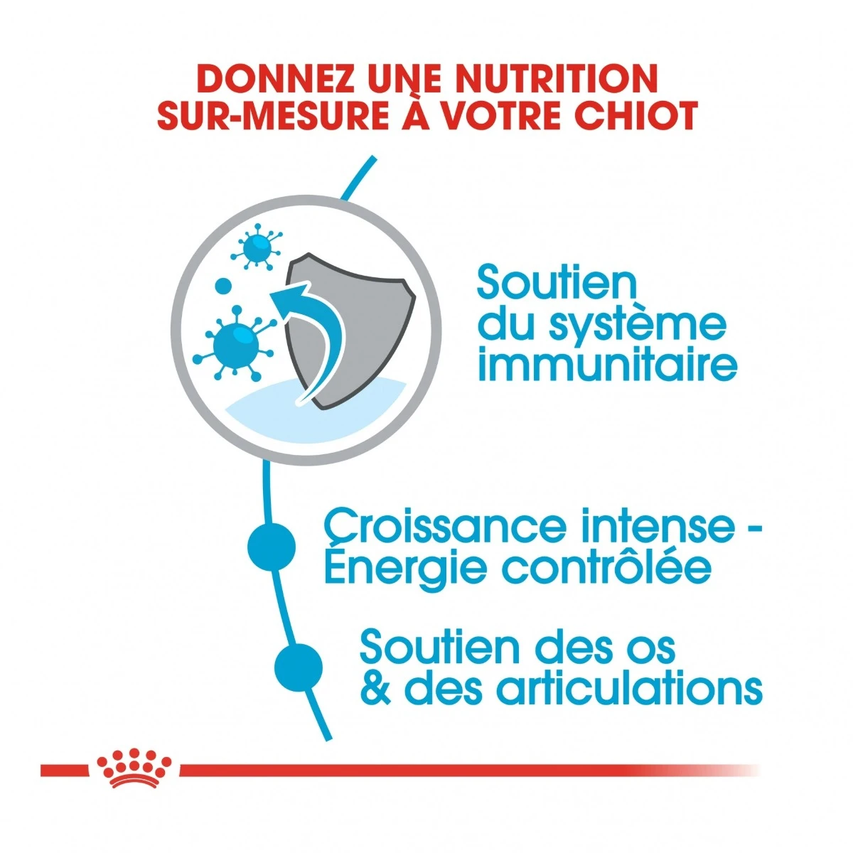Contribue à une bonne minéralisation des os du chiot de très grande taille grâce à un apport énergétique et minéral (calcium et phosphore) équilibré, afin de renforcer l’ossature et des articulations.