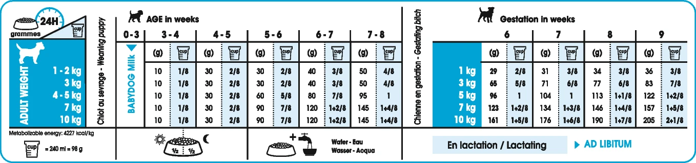 Cette formule est donc spécialement adaptée pour répondre en un seul aliment aux besoins énergétiques élevés de votre chienne de petite race en fin de gestation et pendant la lactation. Elle est également conçue pour favoriser le bon développement des chiots allaités et au sevrage.