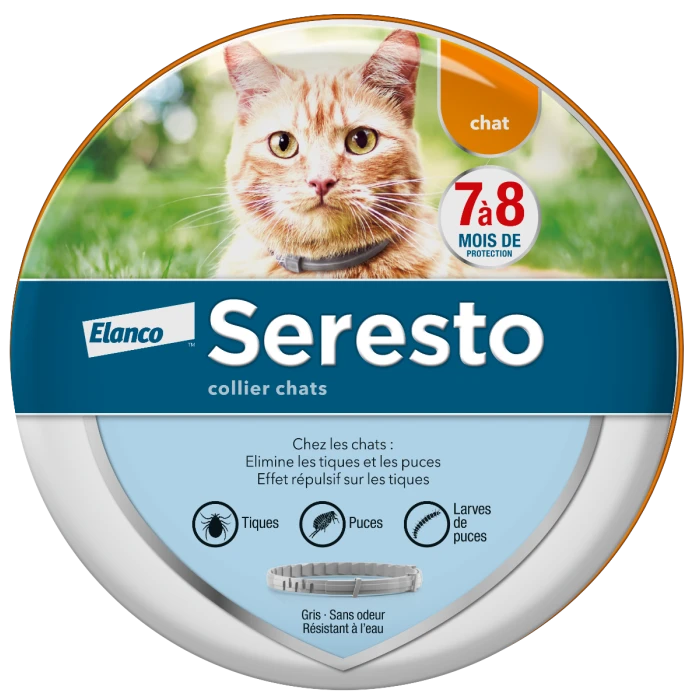 Le collier Seresto est efficace pendant 8 mois contre les tiques, les puces et les larves de puces chez les chats.