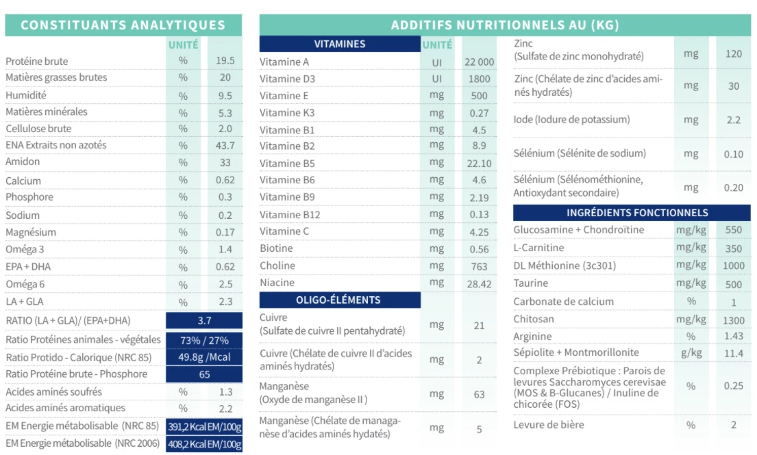 • Apport adapté en protéines de qualité et hautement digestibles pour soulager les reins et limiter