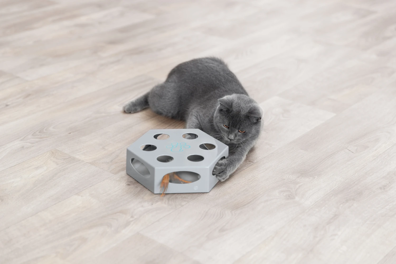 Le jouet pour chat Turning Feather de Trixie stimule l’instinct naturel de chasse de votre chat et lui procure du plaisir tout en favorisant son agilité. À l’intérieur de la boîte hexagonale se trouvent des plumes animées. Mis en mouvement par une simple pression sur un bouton, ils tournoient sauvagement, s’arrêtent soudainement et changent de direction. Comme le mouvement des plumes est imprévisible et qu’elles sortent toujours des ouvertures à un endroit différent, les Turning Feathers offrent un plaisir de jeu varié. Les trous ronds et ovales vous permettent de remplir la boîte de petites friandises et de renforcer ainsi l’effet de mouvement. Les pieds antidérapants assurent la stabilité et la sécurité du jouet, même sur les sols glissants. Un jouet astucieusement conçu pour tous les chats, pour beaucoup de plaisir et plus d’activité.