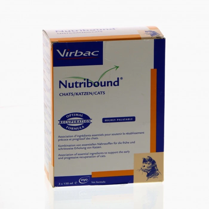 Nutribound® Chats est une solution orale très appétente et prête à l’emploi qui stimule la prise alimentaire et la prise de boisson chez le chat malade ou convalescent jusqu’à la reprise de l’alimentation habituelle.