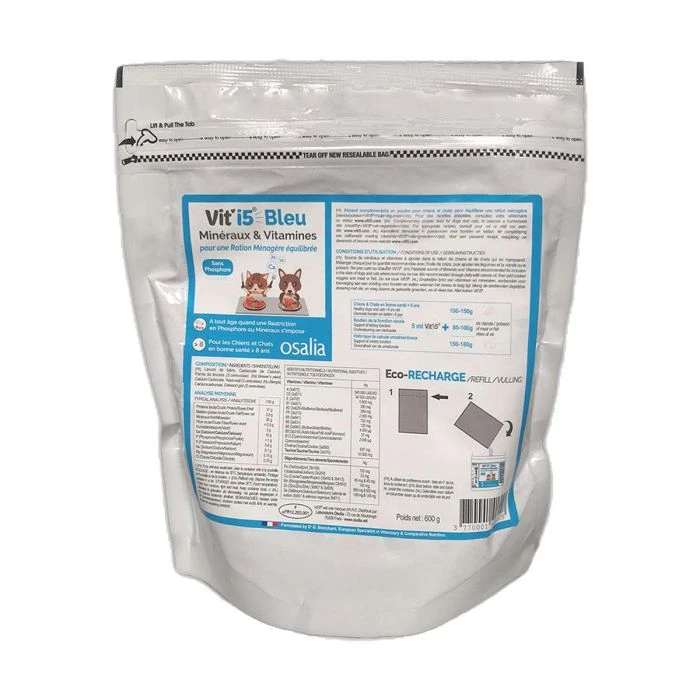 Vit’i5 Bleu est formulé spécifiquement pour équilibrer en minéraux, vitamines et oligo-éléments l’alimentation ménagère des chiens et chats = viande/poisson + Vit’i5 BLEU + huile de colza + légumes +/- féculent.